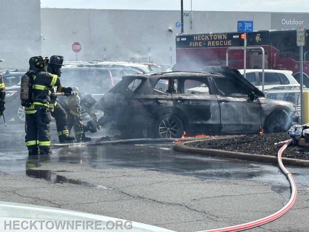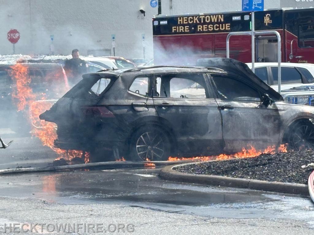 27L1 arrived first and found a four-door vehicle fully involved. The crew deployed an attack line to begin extinguishing the fire.